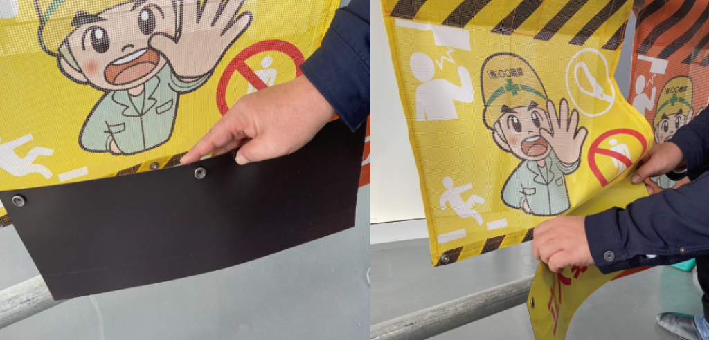 通常の安全表示幕だと左右の端は切りっぱなしが多いですが、弊社では長く使うことによって、お客様のコストダウンに繋がります。